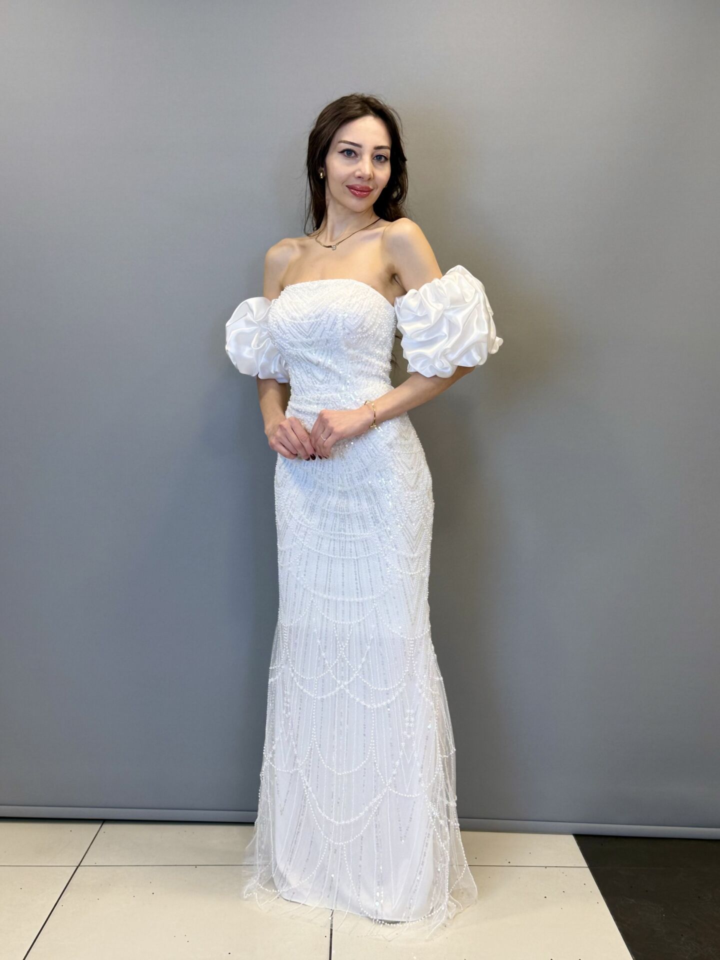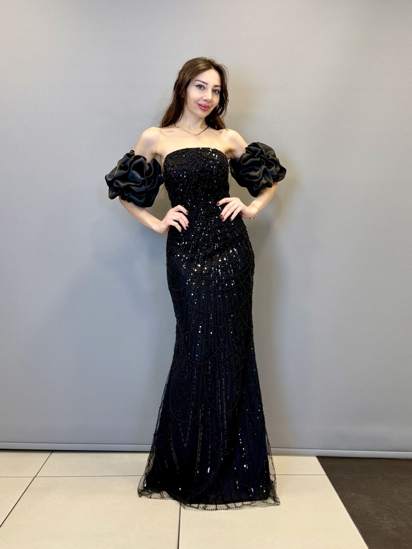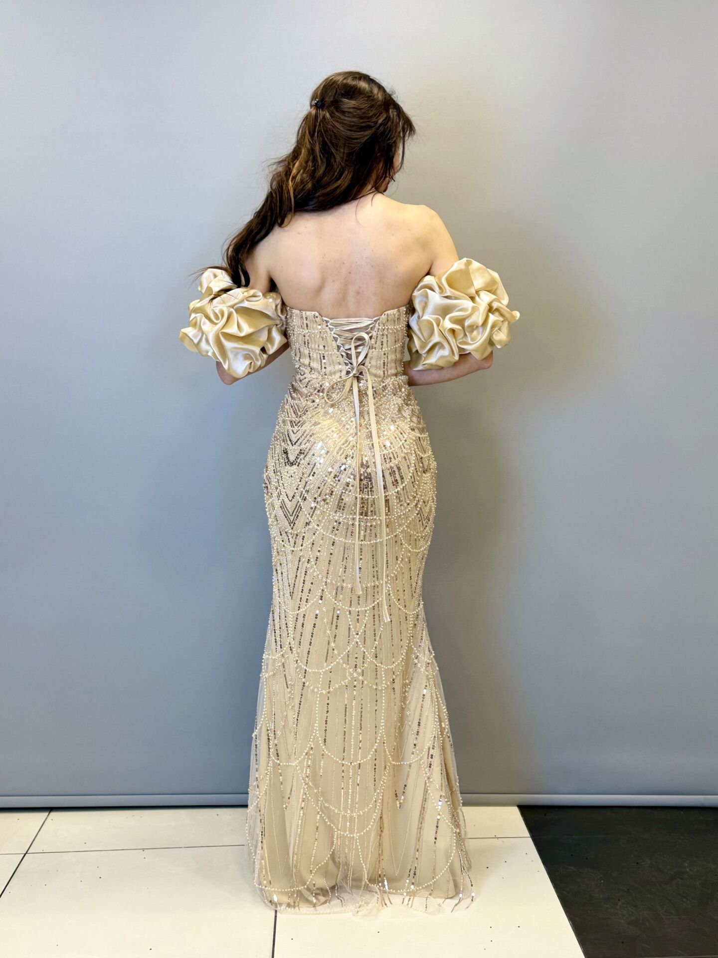 Straplez, pano desen, balon kollu, sırtı bağcıklı abiye elbise