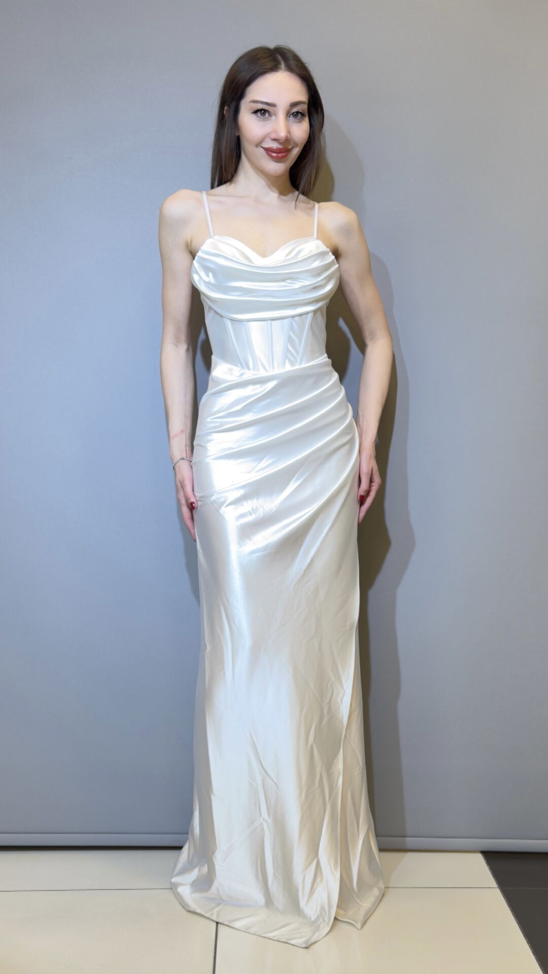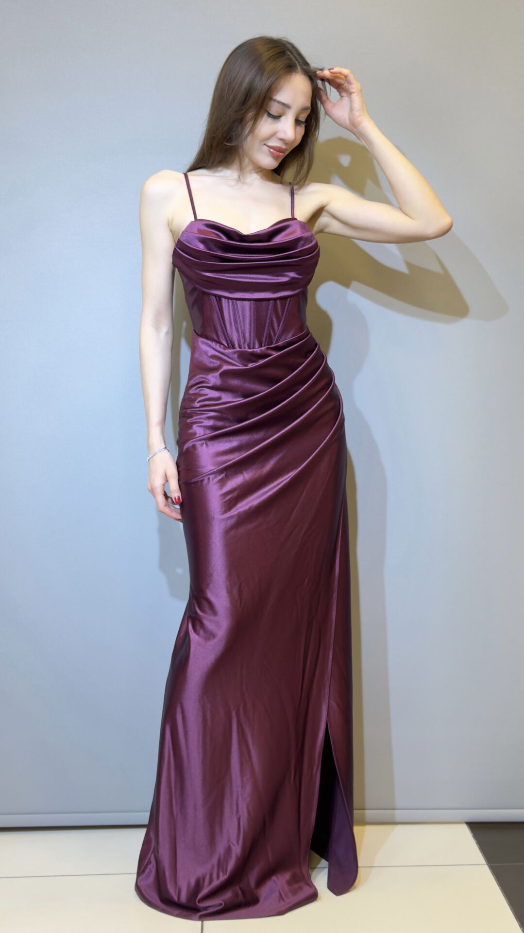 SATEN KUMAŞ, KORSE DETAYLI, DRAPELİ, KAPALI YIRTMAÇ, SIRT BAĞLAMALI ABİYE ELBİSE